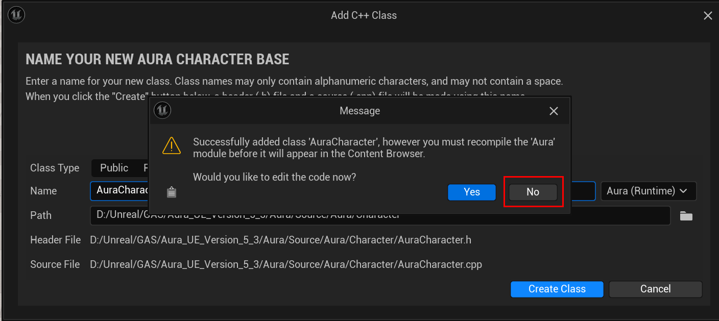 먼저 플레이어 캐릭터를 생성해주는데, 컴파일을 바로 해줄 것이냐는 문구가 뜨는 것을 볼 수 있다.