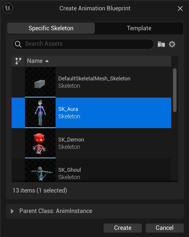 기존 Aura의 스켈레톤을 토대로 애니메이션 블루프린트를 만들어주자.
