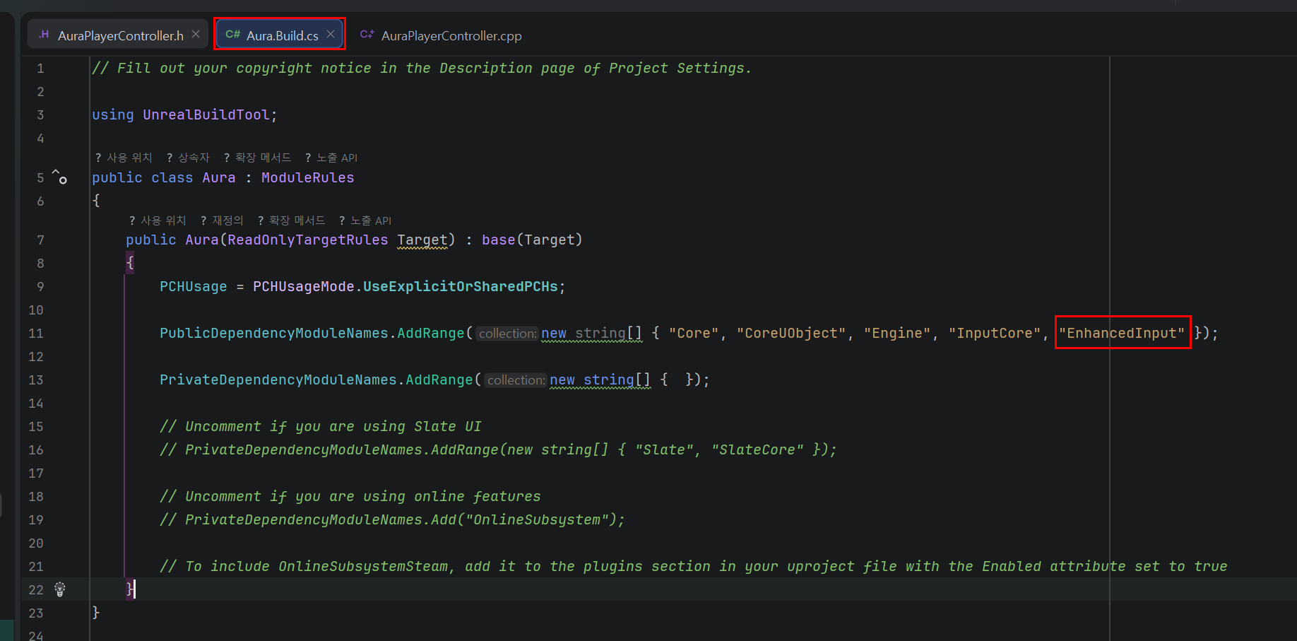그리고 Enhanced Input은 기본 Engine 모듈에 자동 포함되는 게 아니라 명시적으로 Build.cs에 추가해야 사용하는 모듈이기에 해당 내용도 작성해주어야 한다.