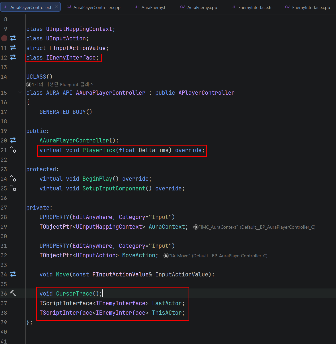 또한 이전 대상과 현재 대상을 비교하여, 하이라이트를 활성화하거나 비활성화할 수 있도록 EnemyInterface를 구현한 액터를 저장하는 변수 두 개를 선언하였다.