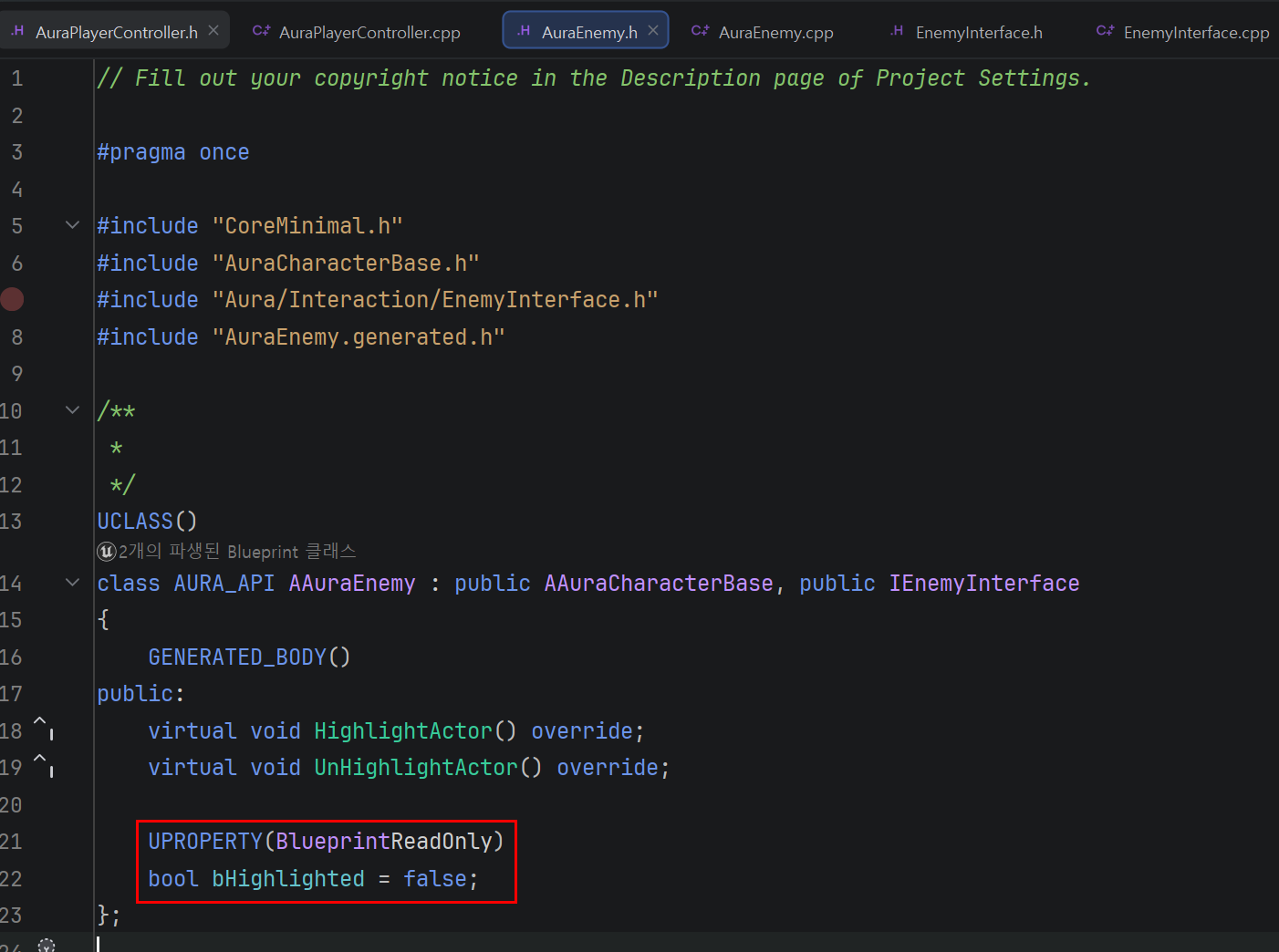이제 다시 적으로 돌아가서 언리얼 엔진 내에서 하이라이트 판별을 위한 변수와 각 함수 내용에 해당 변수를 하이라이트 여부에 맞게 구현해준다.
