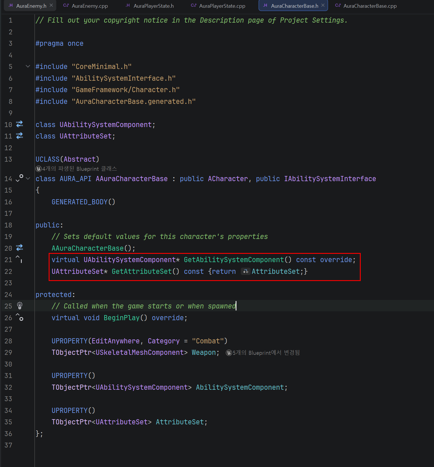 먼저 AuraCharacterBase 클래스에 ASC와 AS를 가리키는 포인터를 추가한다.