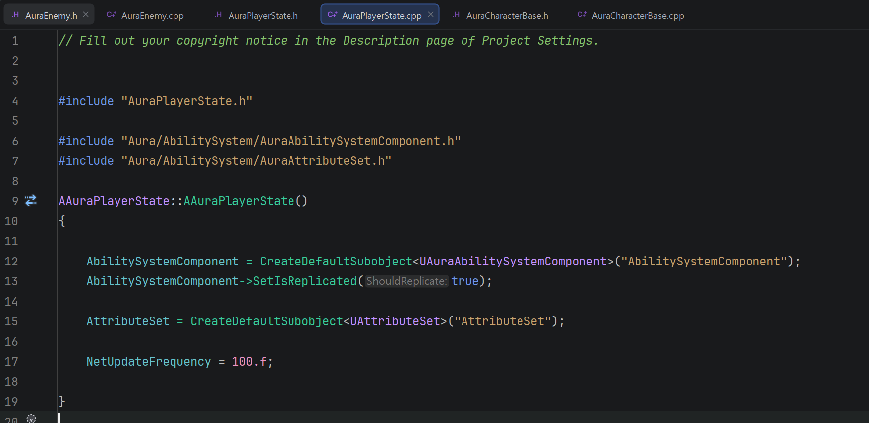 직전의 Enemy의 경우 AuraCharacterBase에서 상속된 클래스이기에 생성자에서 바로 설정해줬지만, PlayerState의 경우에는 별개이기에 헤더에서 포인터를 다시 작성해주어야 한다.