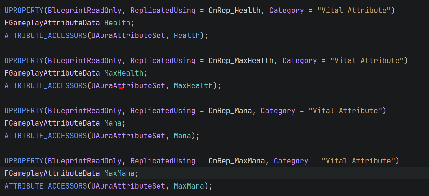 Attribute Set에 Health, MaxHealth, Mana, MaxMana 이렇게 4가지 Attrubte를 추가해주었으니, 이제 이 Attrubte들을 검색하거나 설정할 수 있는 접근자 함수에 대해 쉽게 만드는 방법을 알아볼 것이다.