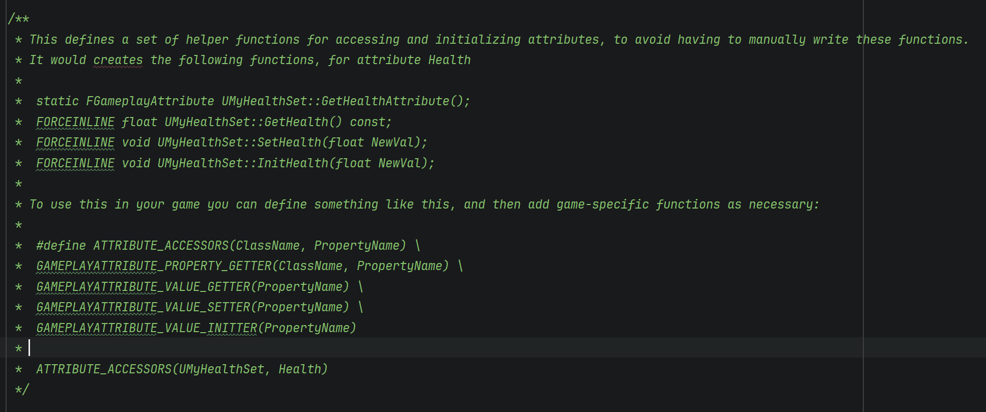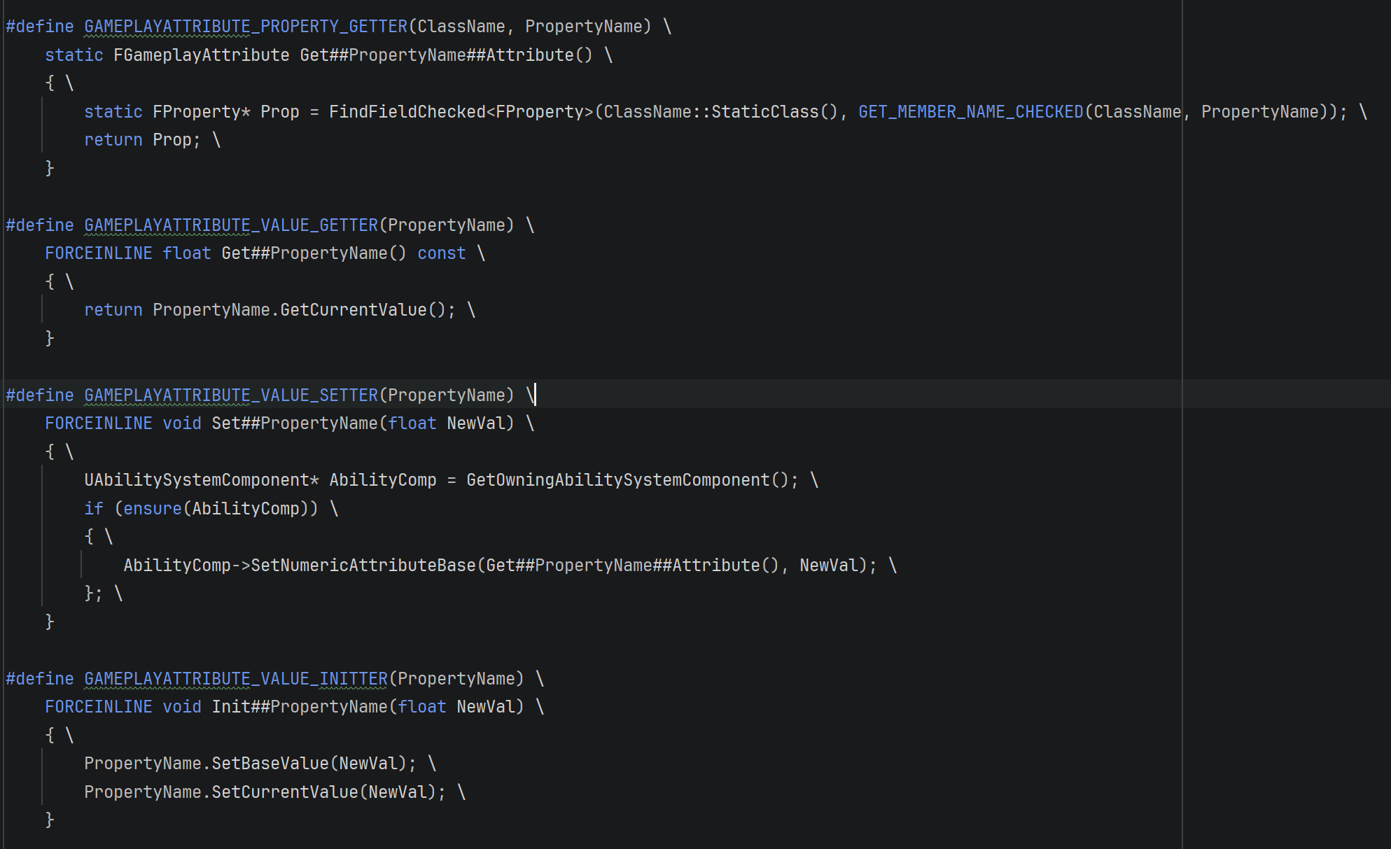 Attribute를 쉽게 다루기 위해 GAS에는 GAMEPLAYTTIRUBUTE_PROPERTY_GETTER()라는 편리한 매크로가 존재한다.