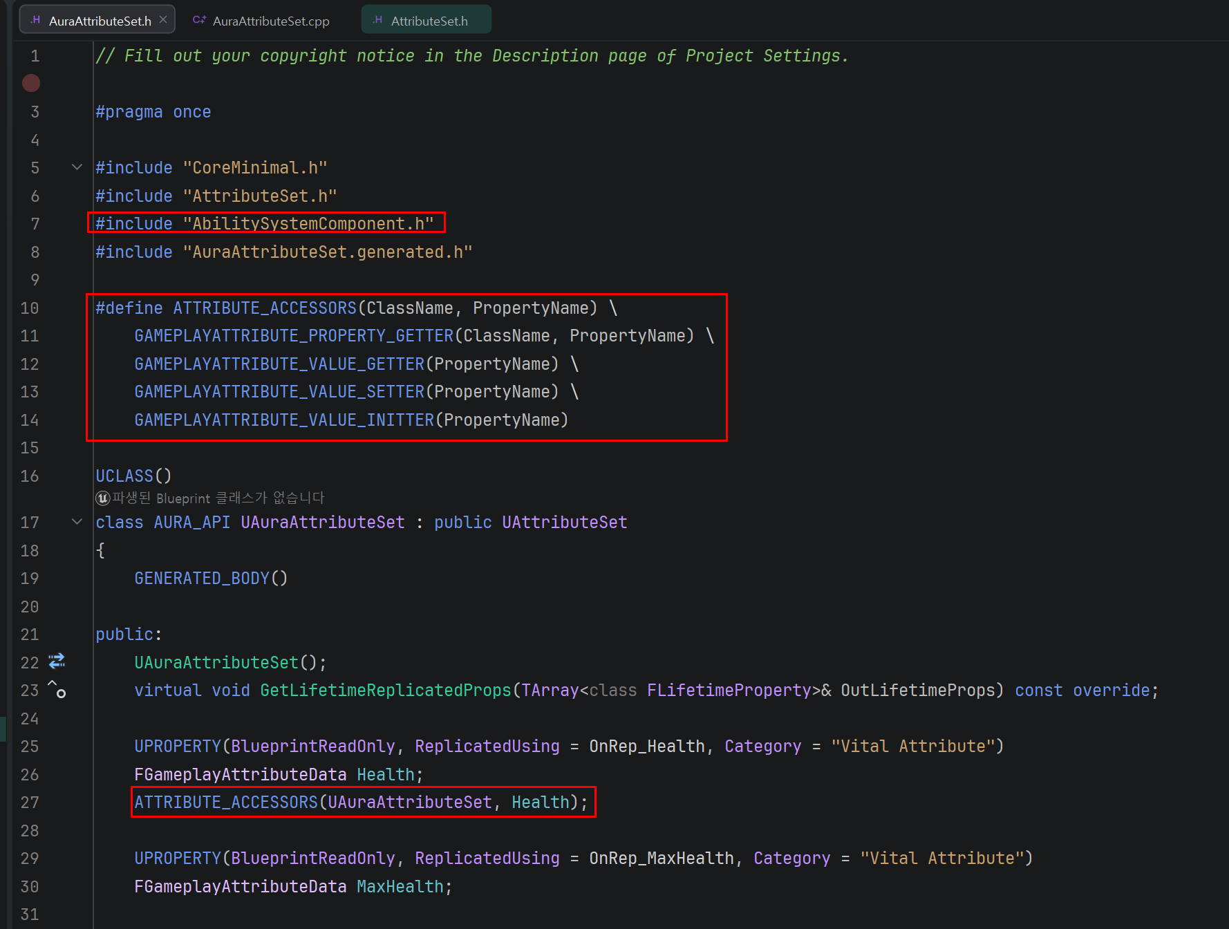 또한 해당 매크로를 사용하기 위해서는 AbilitySystemComponent 헤더를 추가해주어야 한다.