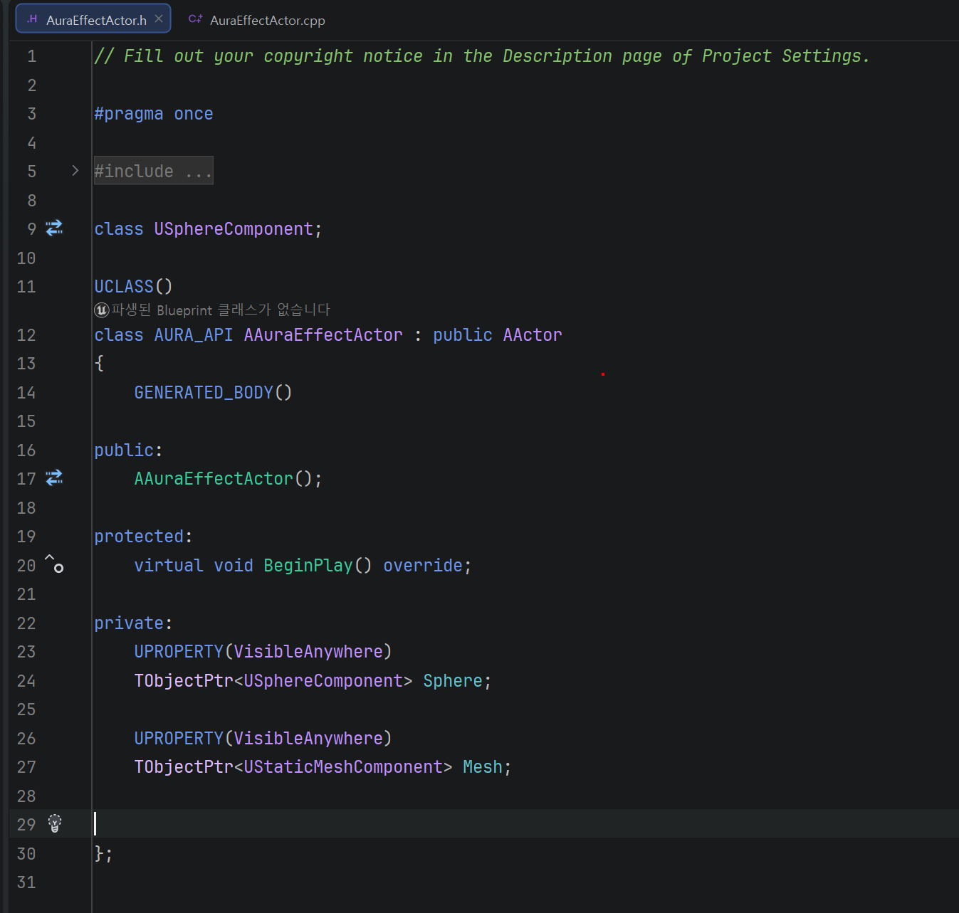 그리고 루트 컴포넌트이자 시각적인 오브젝트로 Static Mesh Component를, 오버랩 감지용으로 루트에 붙일 private 변수인 Sphere Componet를 만들어줄 것이다.