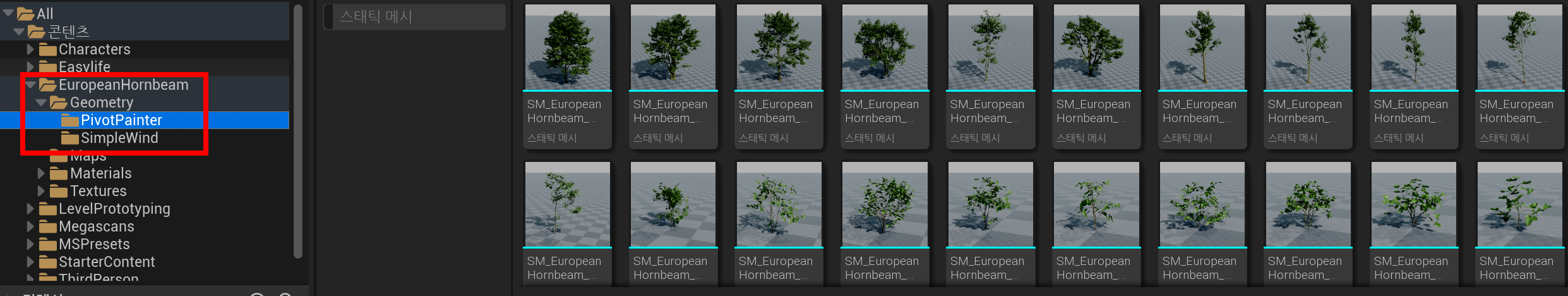 Wind 수치를 조절하면 해당 에셋에 빨간색 표시를 해논 부분이 흔들리는 것을 볼 수 있다.