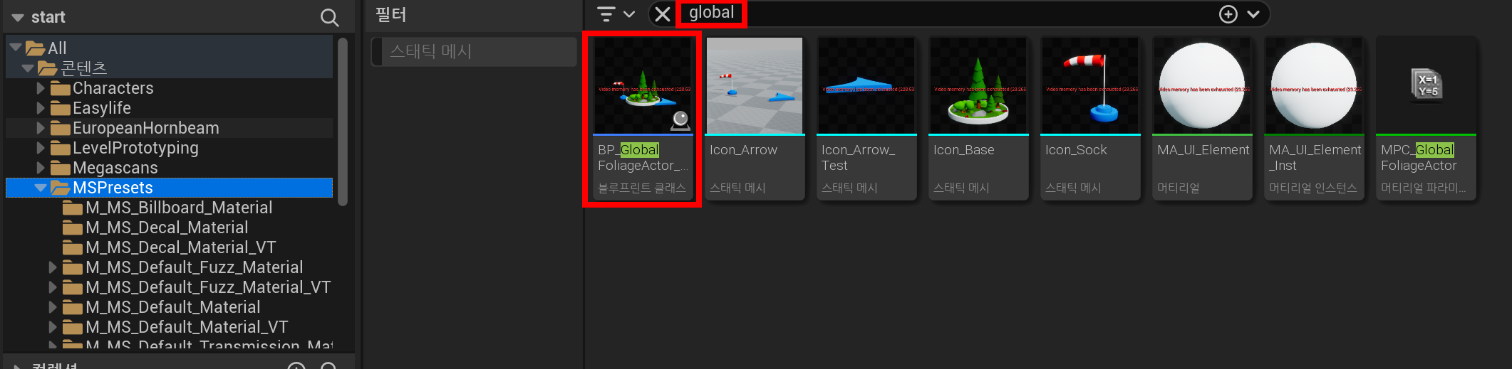 여기서 global을 검색하면 GlobalFoliageActor라는 블루프린트 클래스 에셋이 있는 것을 볼 수 있다.