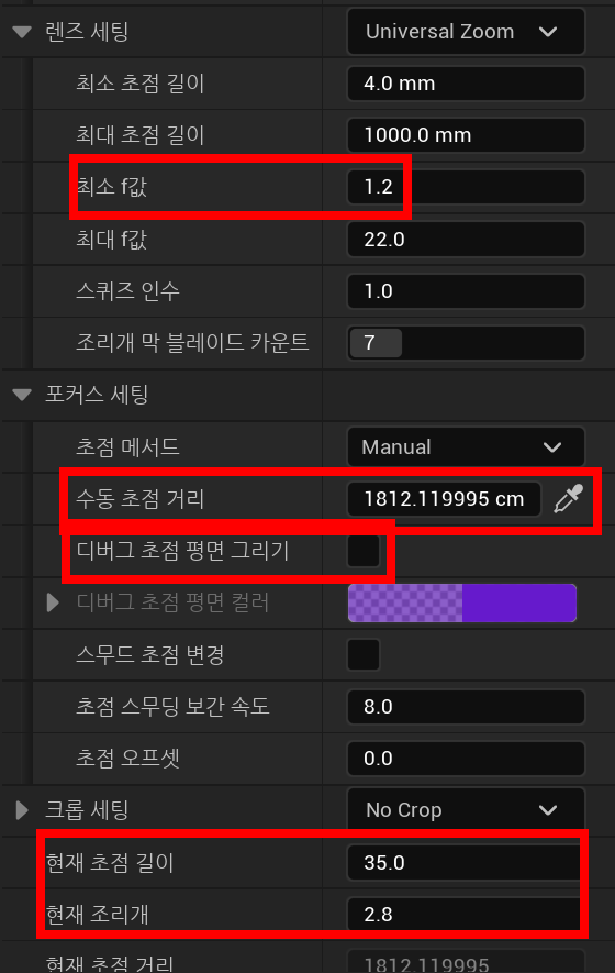 해당 카메라 액터의 디테일 패널에서 초점에 대해 상세한 설정이 가능하다.