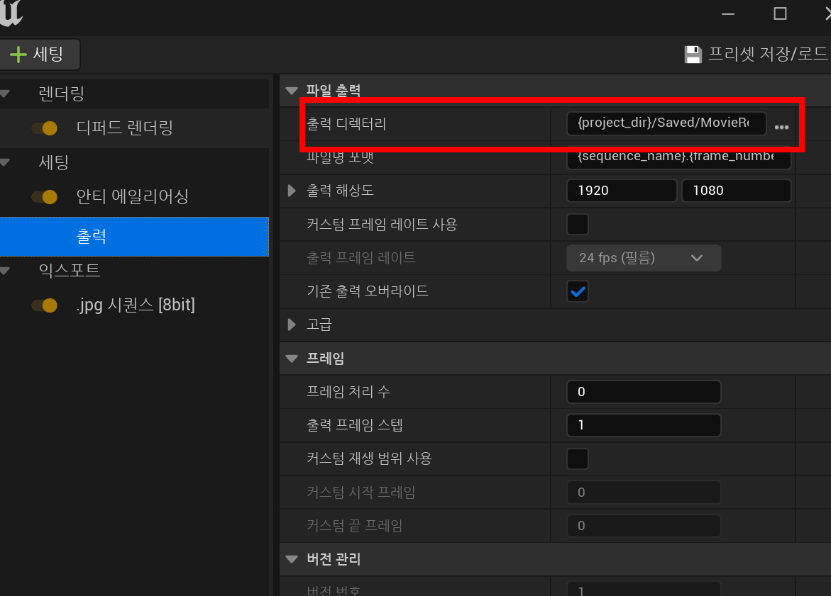 이를 눌러서 무비 렌더 큐를 사용할지, 무비 캡처 씬을 사용할지 정할 수 있다.