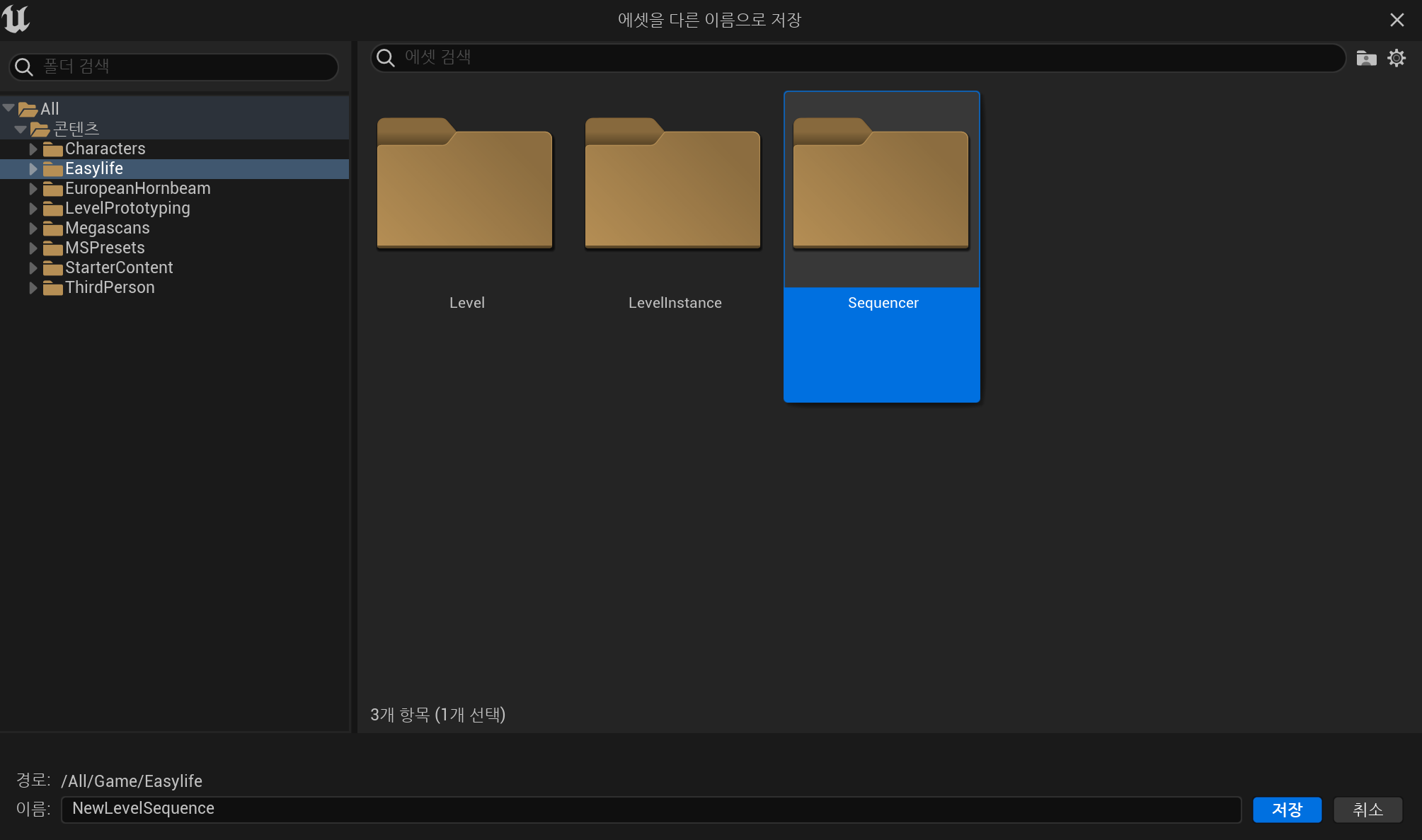 그러면 시퀸스 파일이 생기며, 콘텐츠 브라우저의 해당 폴더에서 시퀸스 파일을 실행할 수 있게 된다.