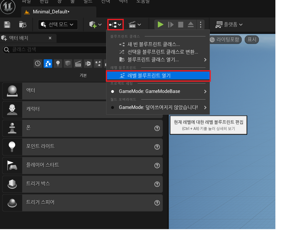좌측 상단을 보면 빨간색 박스로 표시한 곳을 통해 레벨 블루 프린트를 열 수 있다.