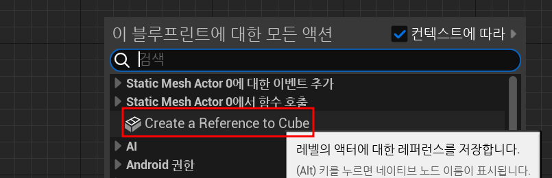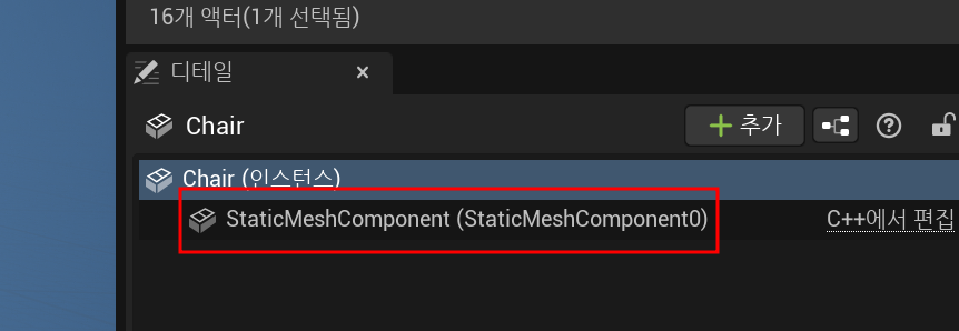 - 우측 디에틸 패널에 액터 아래에 StaticMeshComponent가 존재하며 기본적으로 큐브를 어떻게 그리는 지를 나타냄