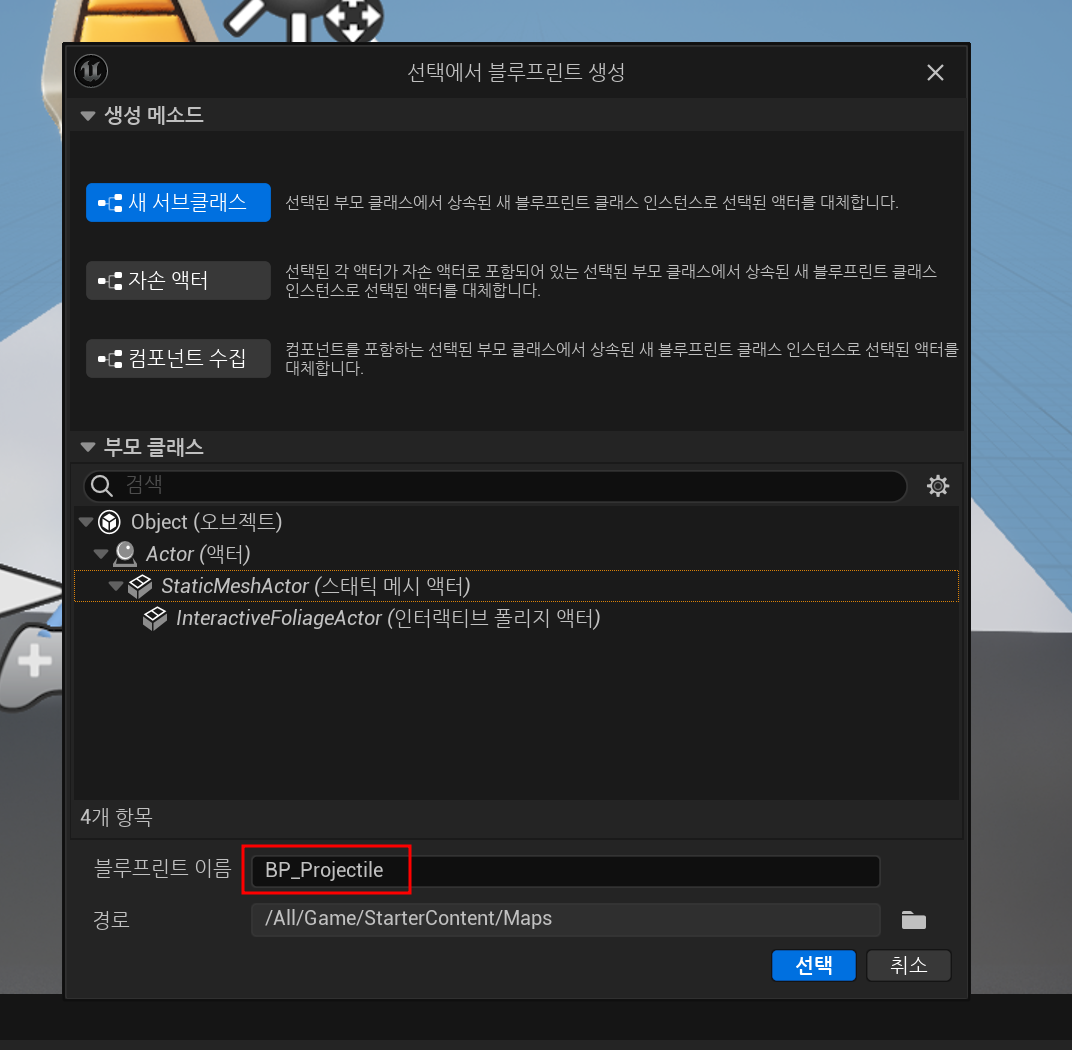 여기서 블루프린트 클래스 이름은 보통 접두어로 BP를 붙여준다.