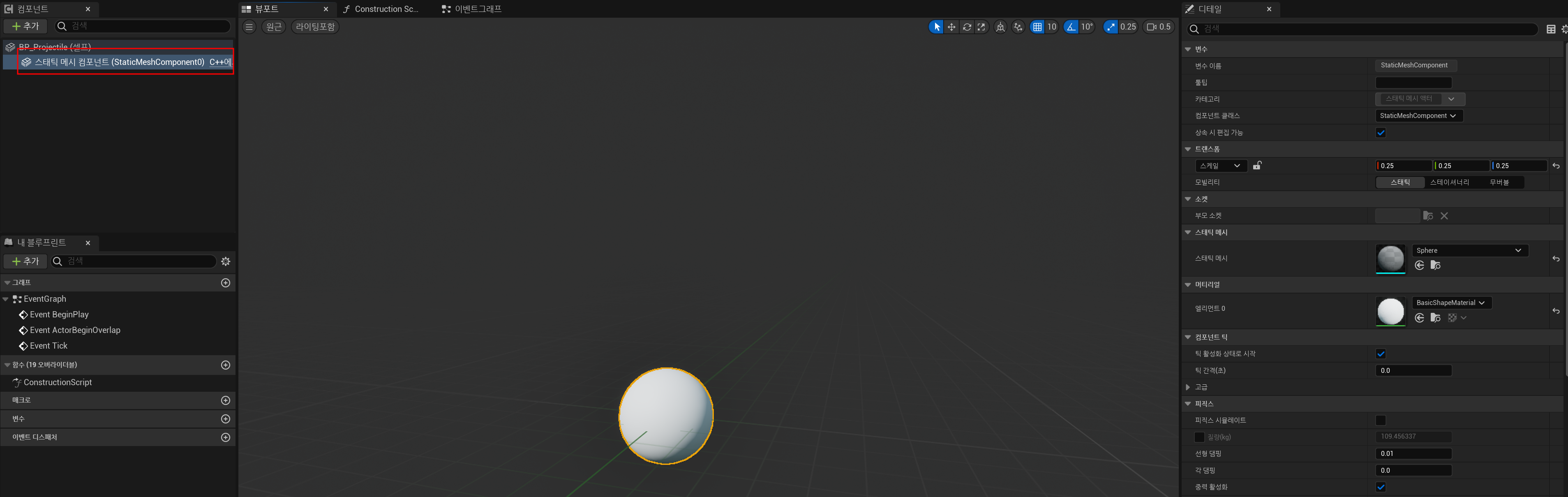 프로퍼티를 살펴보면 머티리얼이 존재하며 여기서 발사체의 머티리얼을 바꿔줄 수 있다.