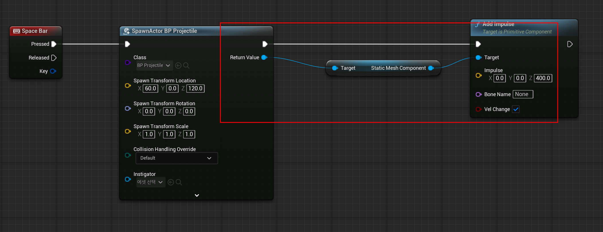 추가적으로 기존에 큐브에 연결된 임펄스를 새롭게 만들어진 발사체에 추가시켜주었다.