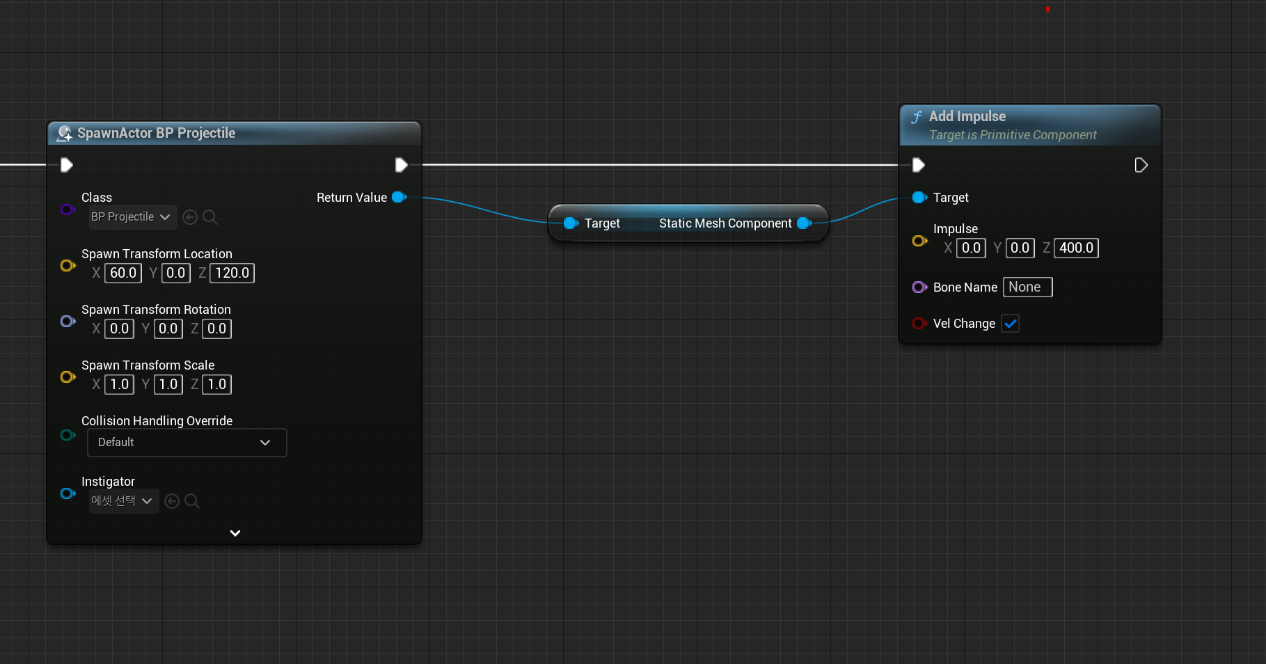 Spawn Transform Location은 벡터 타입, Impuse는 벡터 타입, Vecl Change는 부울 타입, xyz 값은 Floats 타입인 것을 확인이 가능하다.