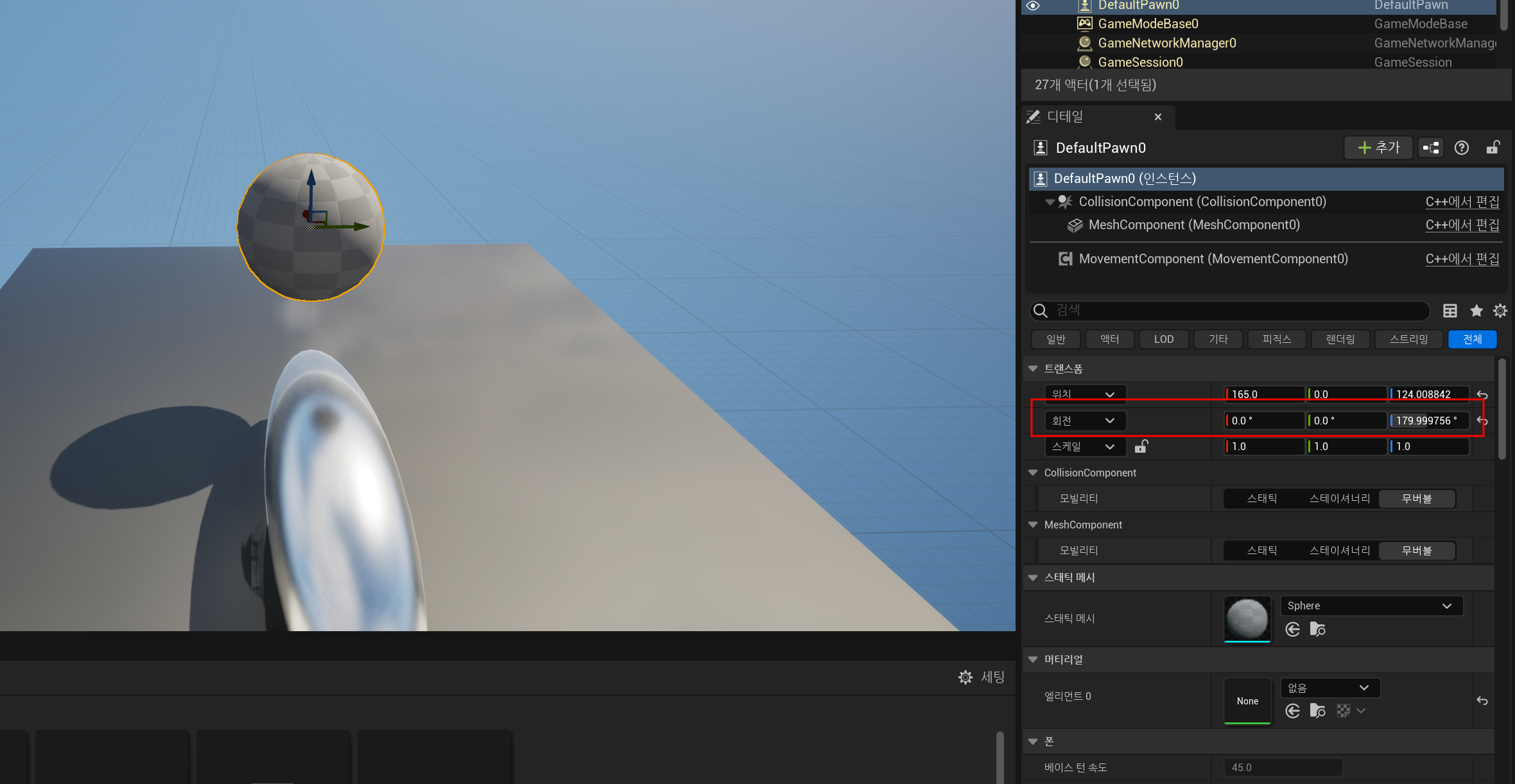 플레이 화면에서 다시 F8을 누르고 폰을 보면 디테일 패널에서 회전 값 확인이 가능하다.
