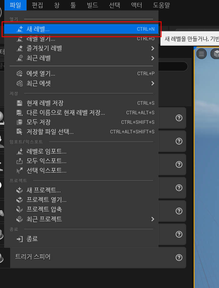 기존에 있는 레벨을 수정하며 만드는 것보단 처음부터 직접 만들어 보고자 우선 새 레벨을 만들어준다.