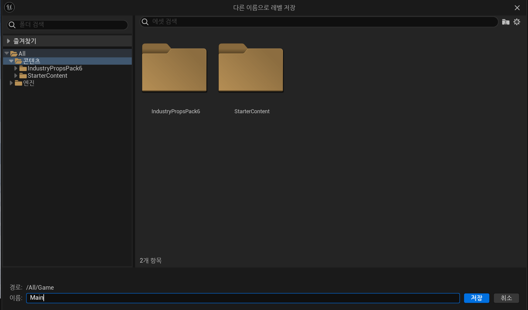 Ctrl+S를 통해 저장을 할 수 있으며, 위치를 콘텐츠 폴더로 지정해주었다.