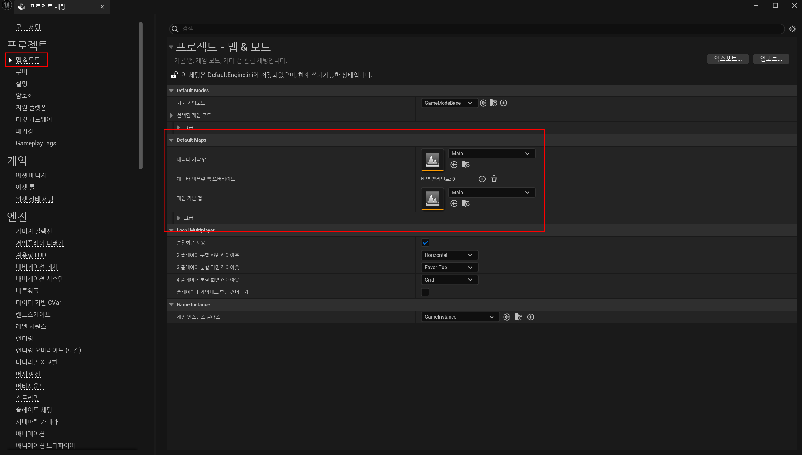 프로젝트 세팅 -> 좌측 맵&모드를 누르면 우측에 Default Maps을 볼 수 있다.