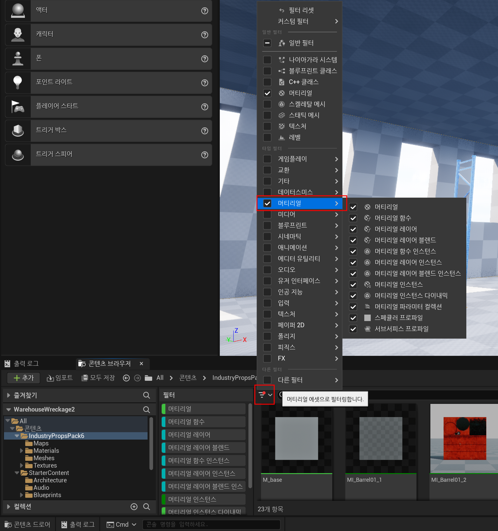 위 이미지와 같이 콘텐츠 폴더에 필터링을 걸러 Material만 따로 보는 것이 가능하다.