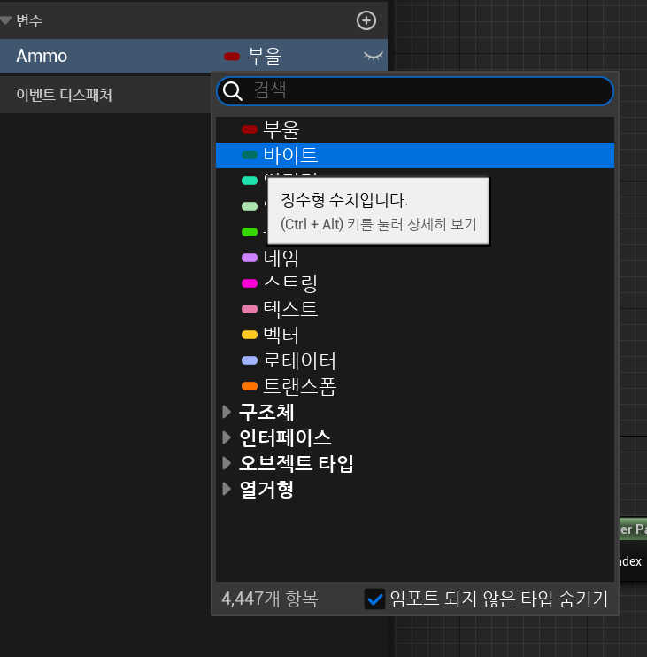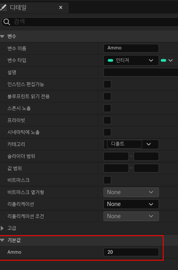 여기서 탄약이라는 이름의 변수를 추가해주고, 타입을 정수(인티저)로 바꿔준다.