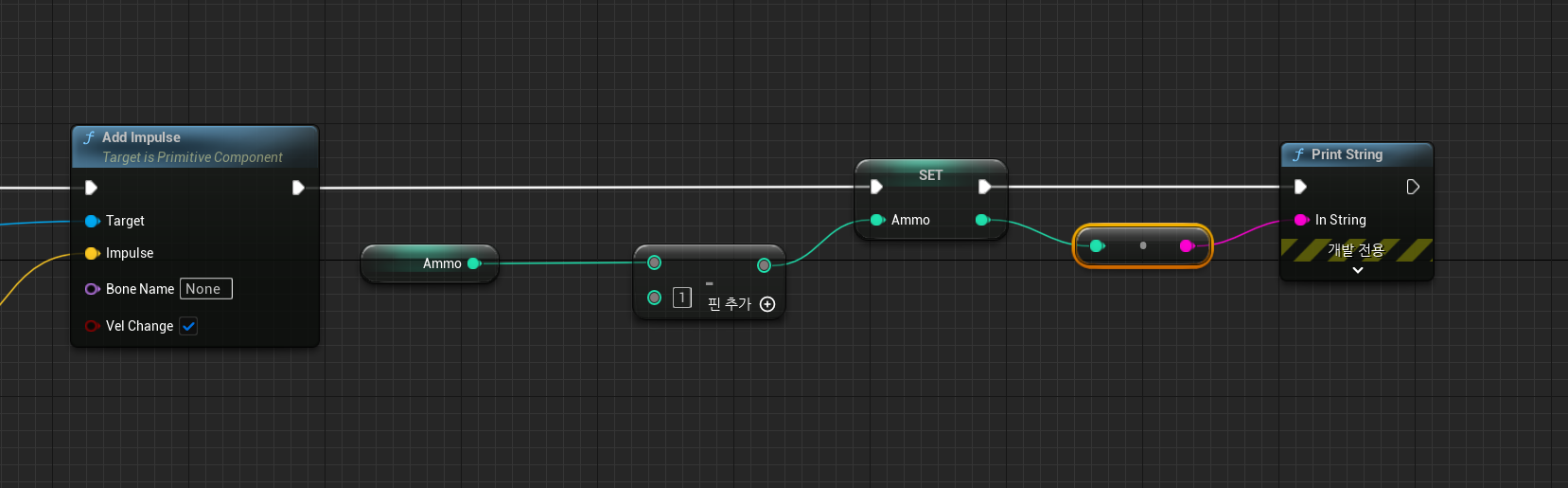 Set Ammo의 입력핀에 1이 감소된 탄약 정보를 가져오고, 이를 발사한 후에 실행되도록 Add Impulse 실행핀에 연결한다.