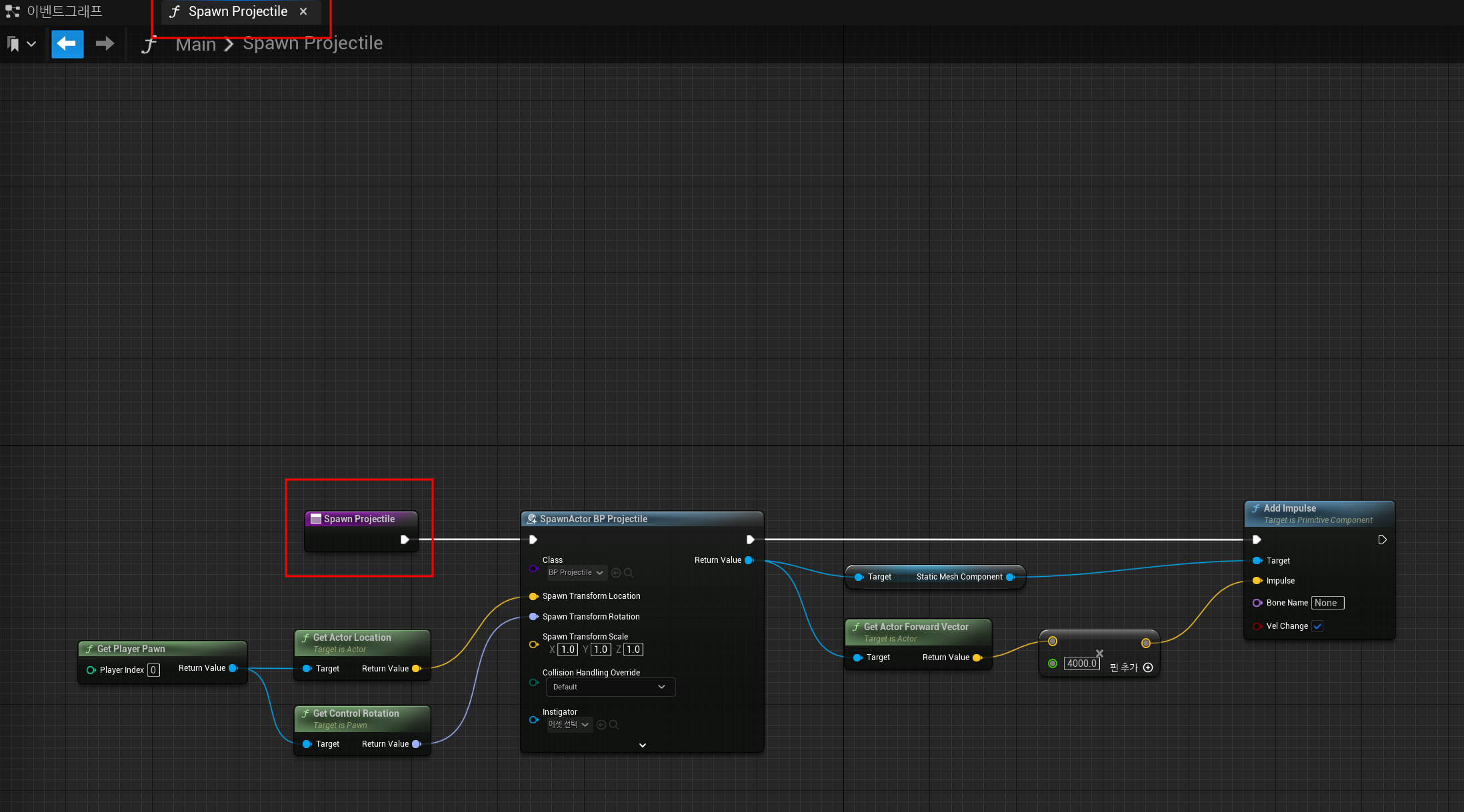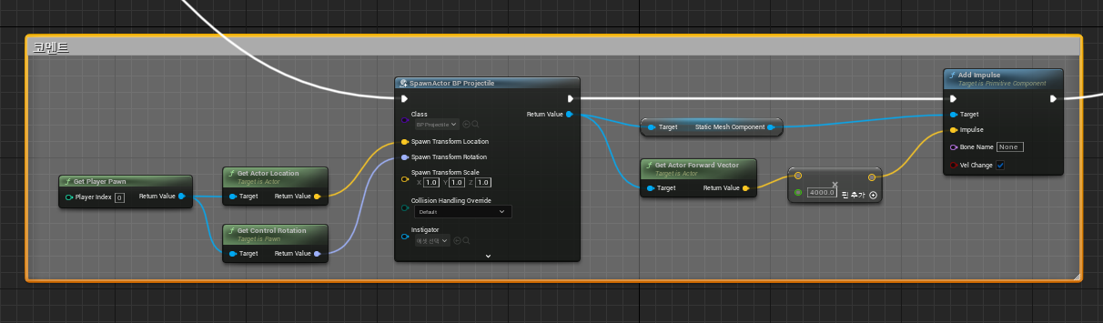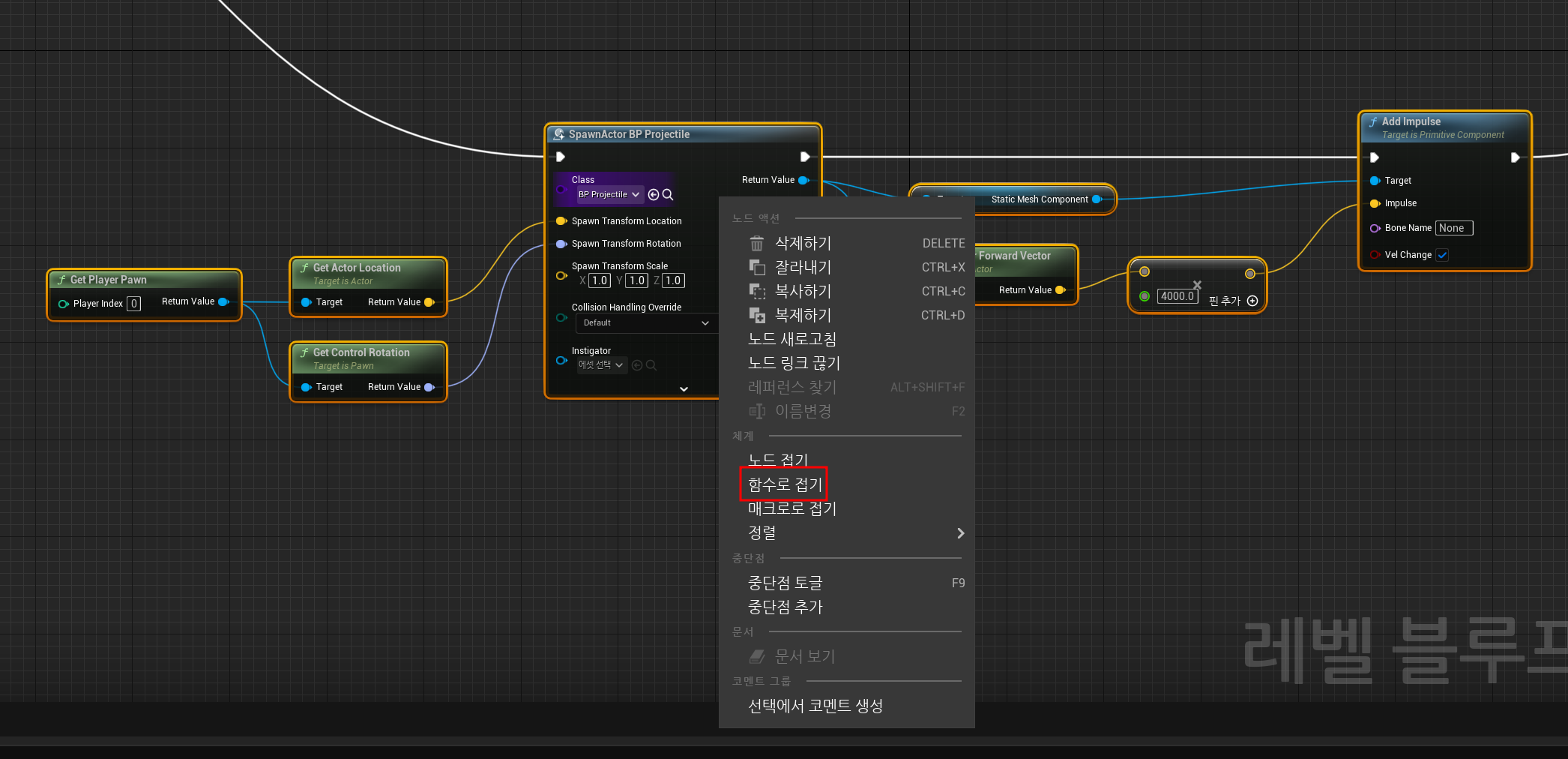 플레이어 폰을 가져와서 충격을 주는 노드들 까지 모두 드래그하여 우클릭을 하면 함수로 접기가 존재한다.