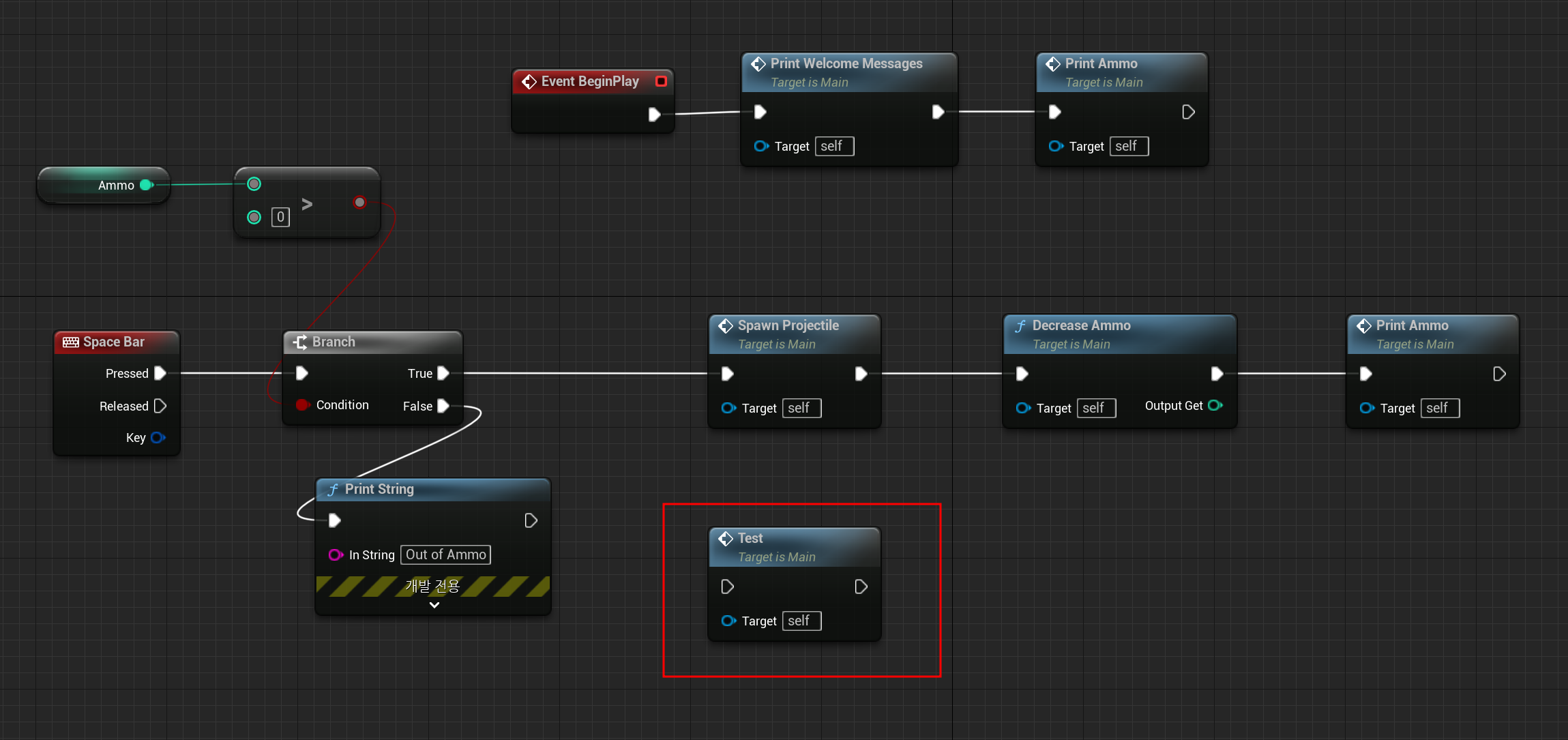 탄약 갯수가 0개 보다 많은지를 체크하는 2개의 노드를 하나로 묶어 Has Ammo라는 이름의 함수로 만들었다.