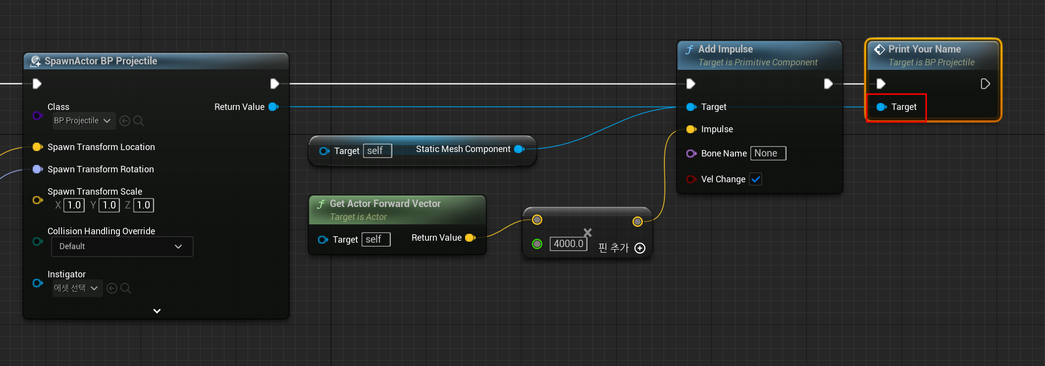 그리고 시작노드 Launch는 Add Impusle에 실행핀을 연결해준다.