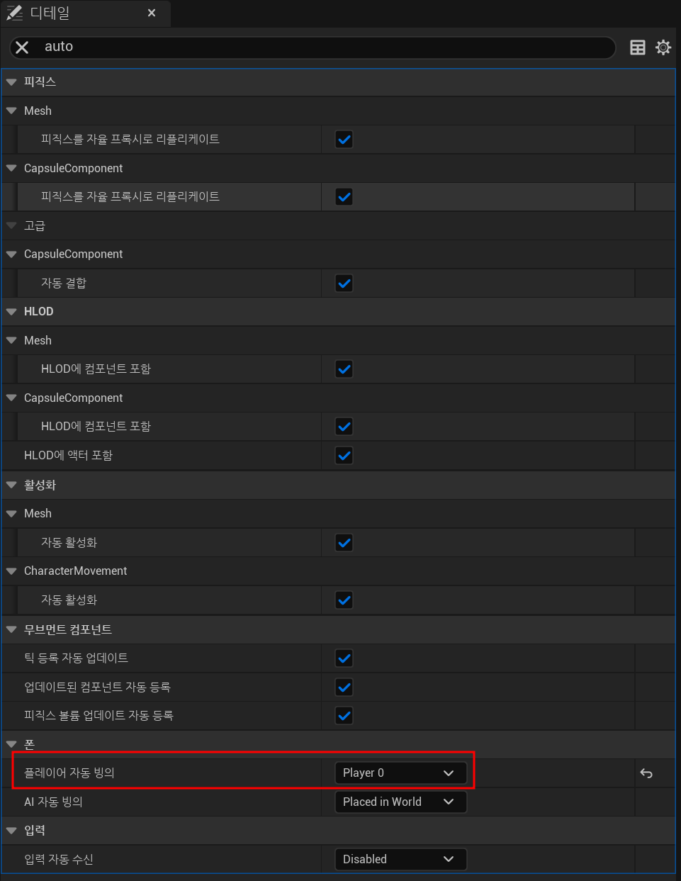 해당 칸은 기본으로 비활성화되어있으며, 이를 Player 0으로 활성화를 해주면 해당 캐릭터가 최우선으로 빙의되게 된다.