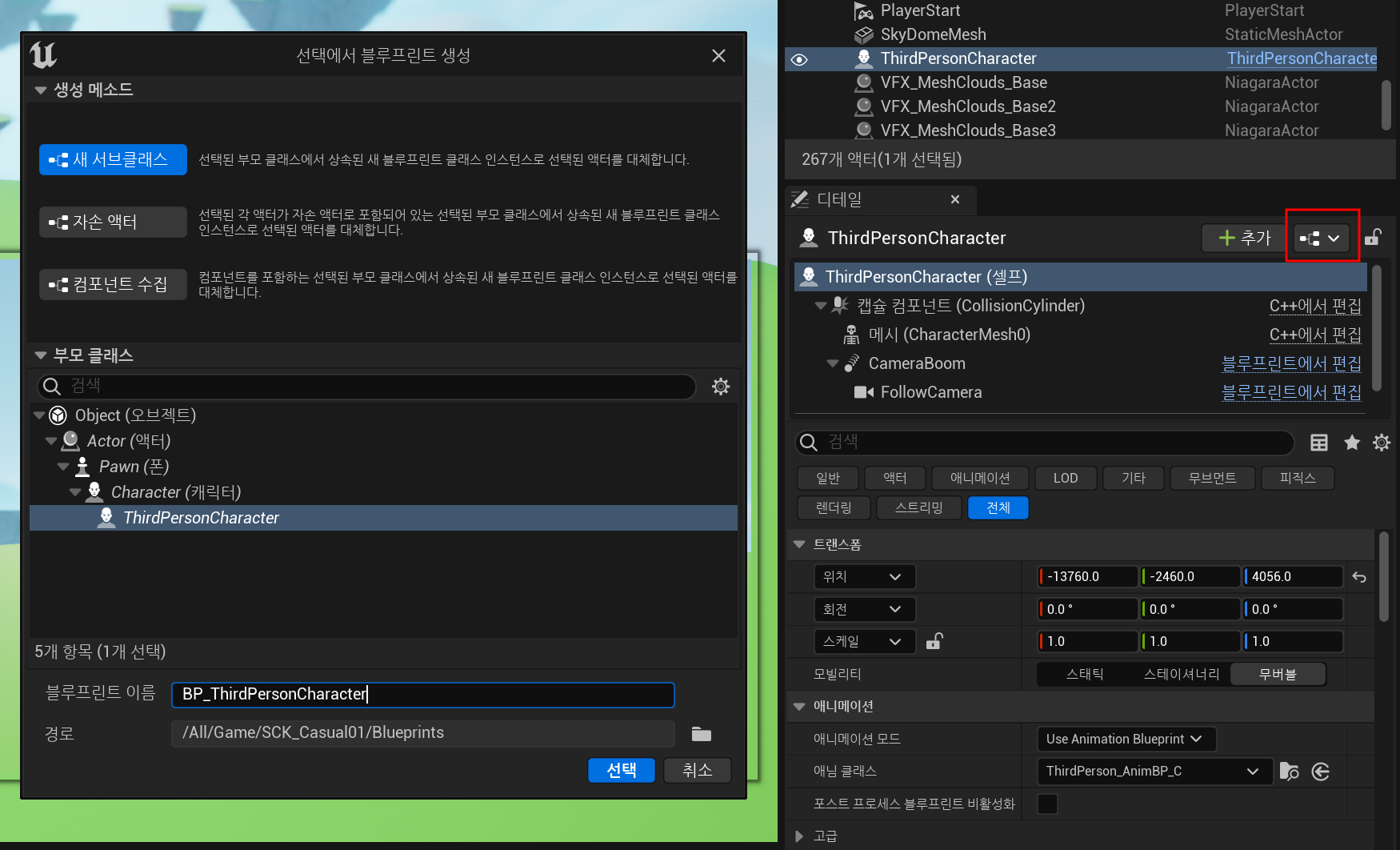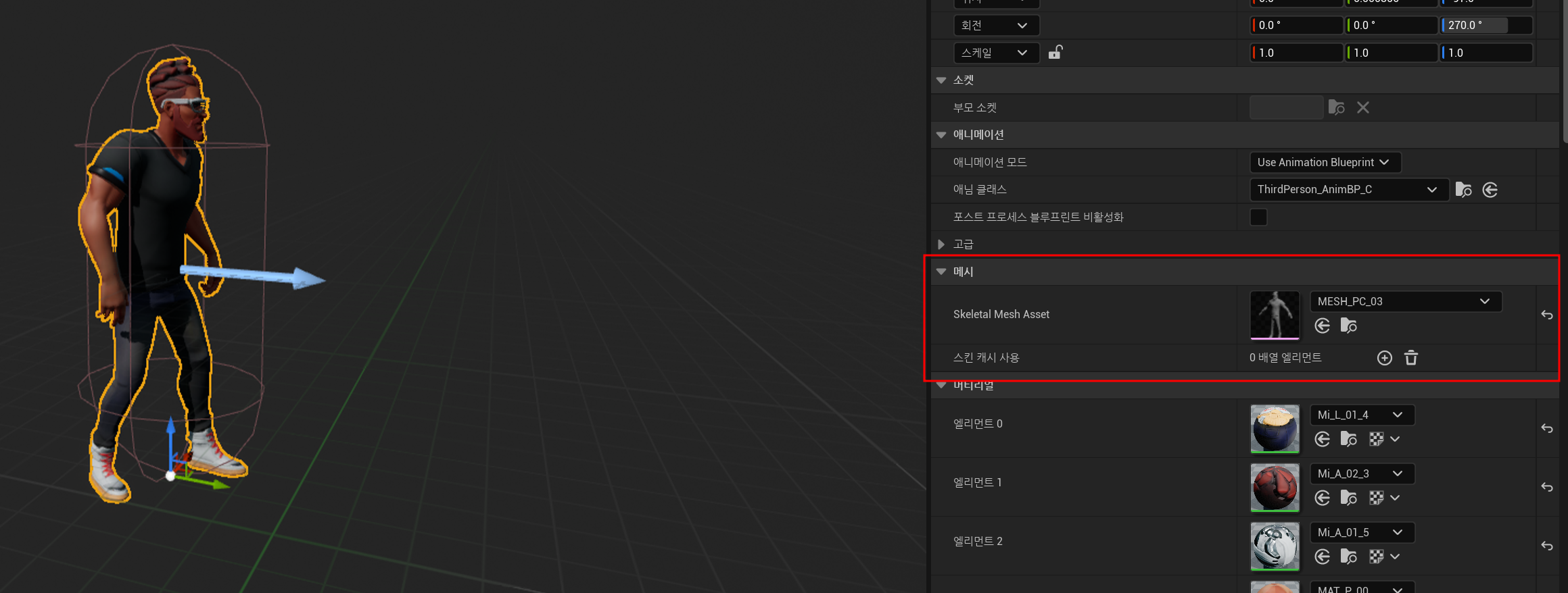 만들어줬던 3인칭 캐릭터 블루프린트 클래스 디테일 탭에서 원하는 메시로 바꿔주면 간단하게 할 수 있다.