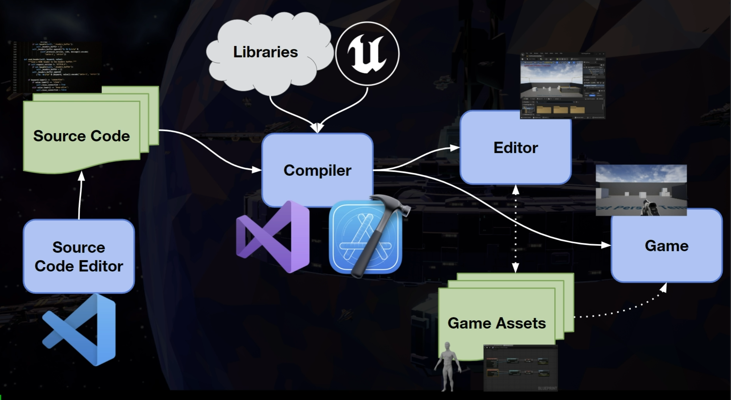 컴퓨터가 소스 코드를 가져가서 언리얼에 내장된 라이브러리 및 기능들을 가져와 모두 컴파일해 바이너리로 전환해준다.