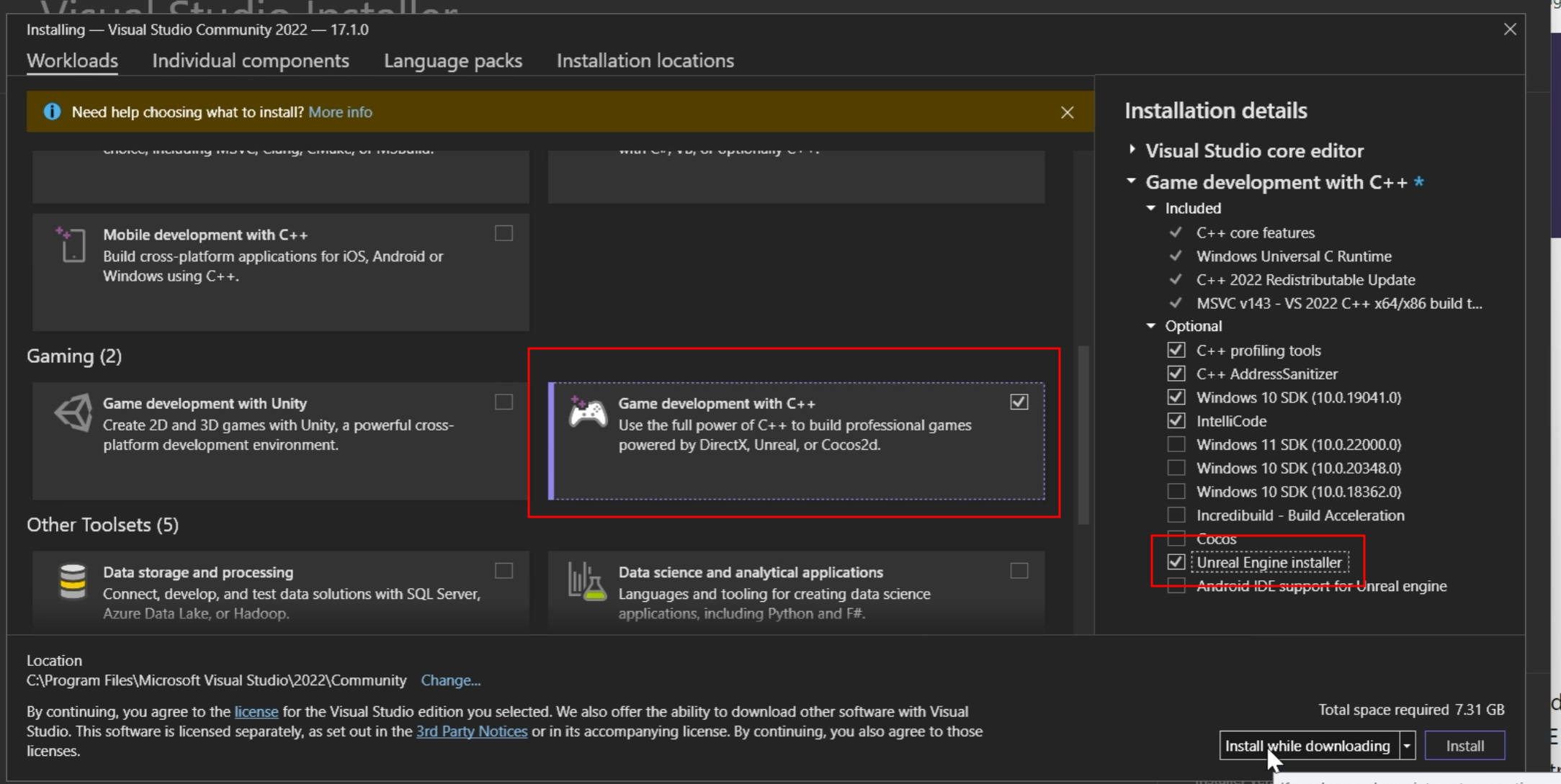 우리는 언리얼을 다루기 때문에 이에 필요한 Game Development with C++ 항목을 선택해 다운해주며, 이때 우측에 존재하는 추가옵션에서 Unreal Engine installer로 같이 체크해서 다운받아줘야 한다.