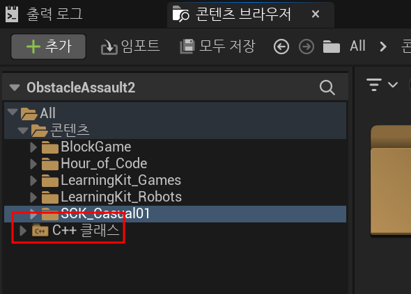 이제 무사히 컴파일링이 끝나고 다시 언리얼을 켜서 돌아가면 콘텐츠 폴더에 C++ 클래스가 생성된 것을 볼 수 있다.