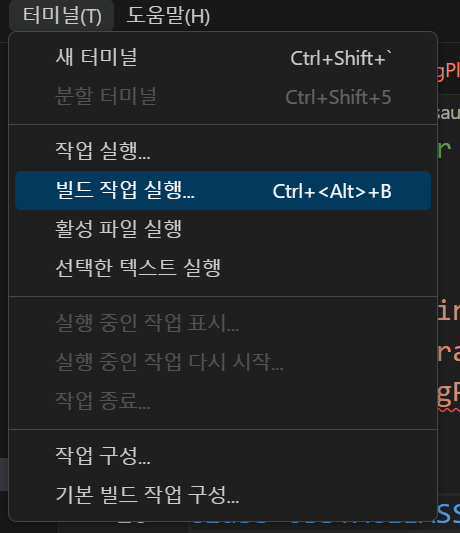빌드는 상단 터미널 에서 직접 눌러주거나 단축키로 쉽게 실행할 수 있다.