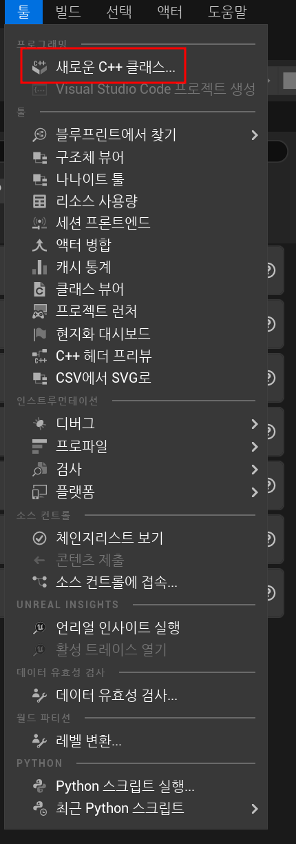 상단 툴에서 새로운 C++ 클래스를 선택하여 생성이 가능하다.