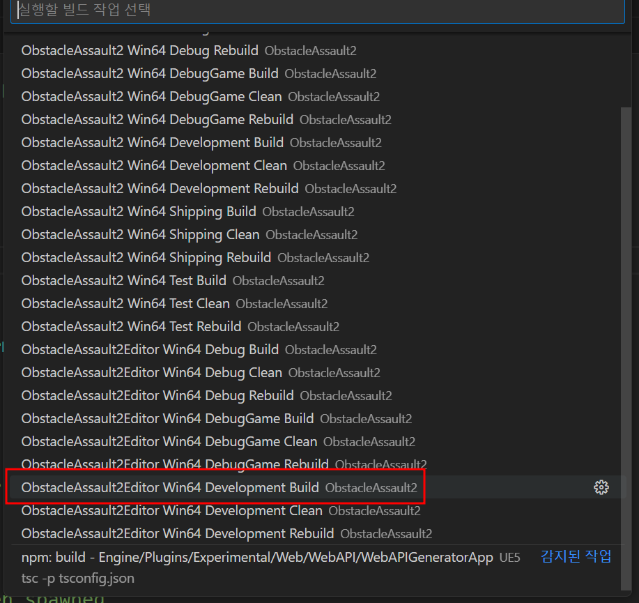 현재 프로젝트명에 해당하는 에디터 + 윈도우 + 개발자 모드를 선택하여 빌드를 해주면 된다.