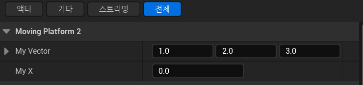 마찬가지로 언리얼에 노출시키기 위해 UPROPERTY(EditAnywhere)를 작성해주고, 이번에는 FVector 타입을 선언한다.