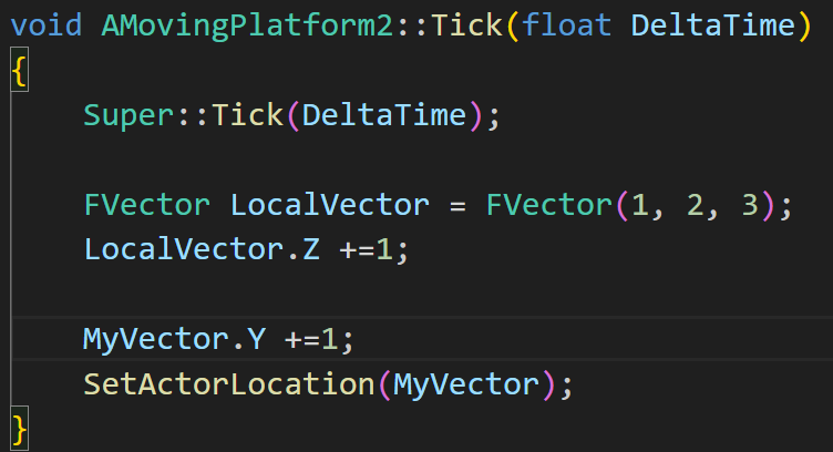 로컬변수로 할당하는 MyVector의 값은 매 프레임마다 Y값이 증가하지만, Z 값은 그대로이므로 여기에 Z 값을 추가로 더해줘봤자 다시 MyVector의 Z 값으로 돌아갈 뿐이다.