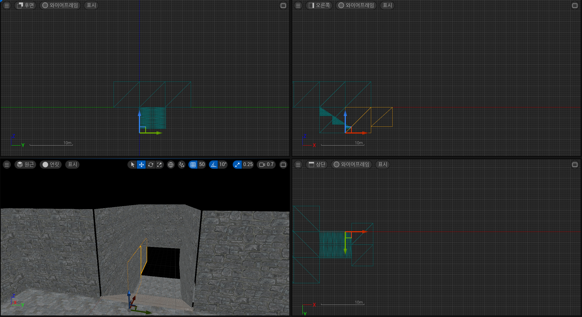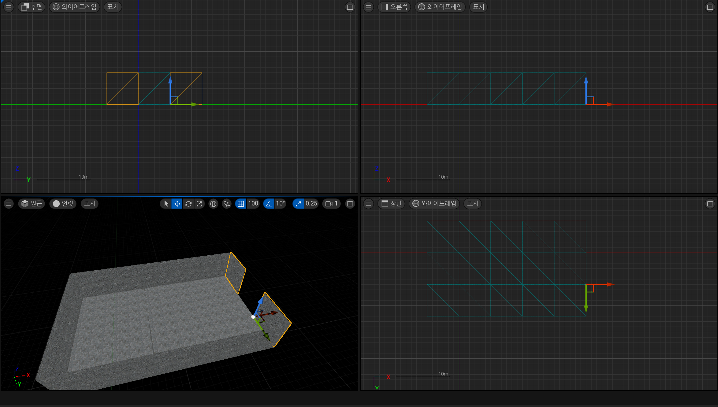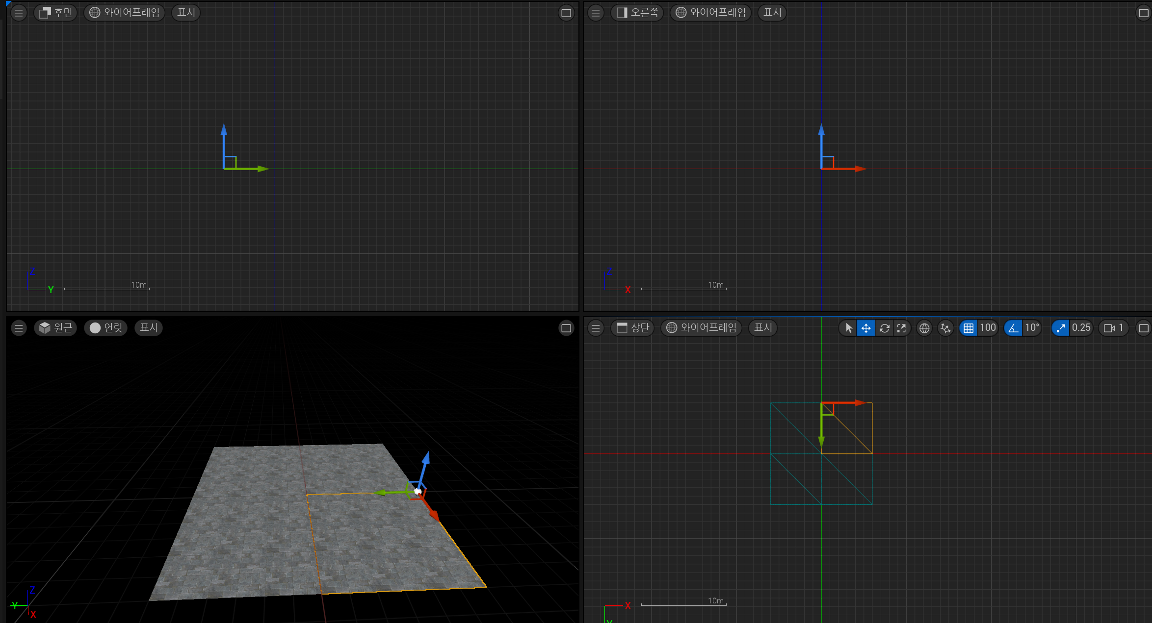 배치는 다방면에서 에셋의 배치를 체크하기 쉬운 4분할 화면으로 진행하게 된다.