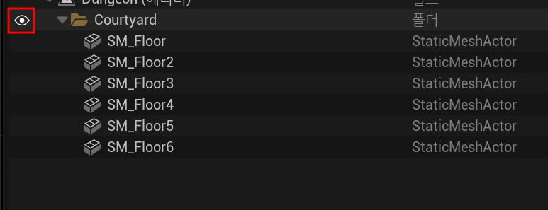 해당 폴더 좌측 눈모양 표식을 누르면 해당 폴더의 에셋들이 전부 뷰포트에서 사라지는 것을 볼 수 있다.
