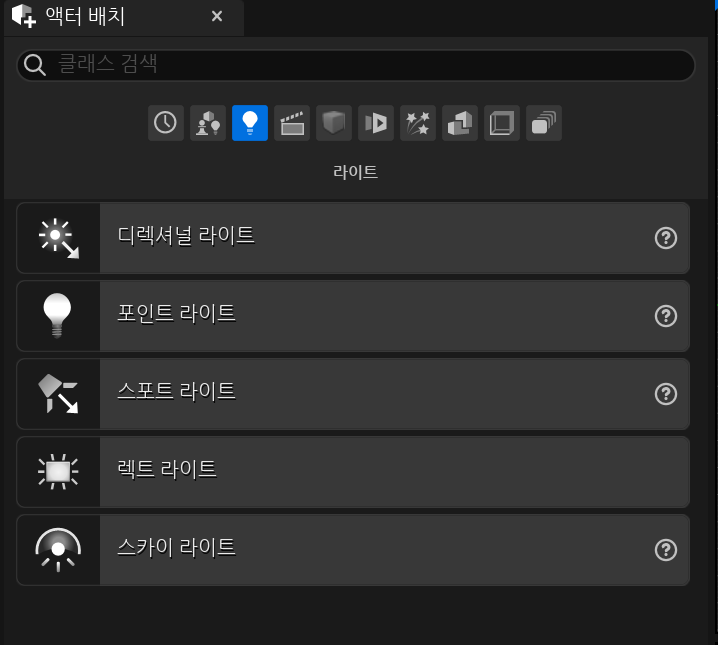 먼저 액터 배치 패널 라이트 부분에서 다음과 같은 라이트를 확인할 수 있다.