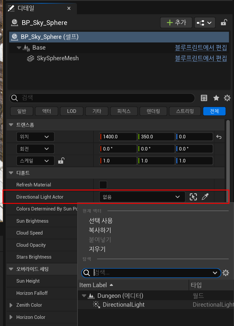 기존에 넣었던 구인 BP_Sky_Sphere에 이 디렉셔널 라이트를 링크해주는 것이 가능하다.