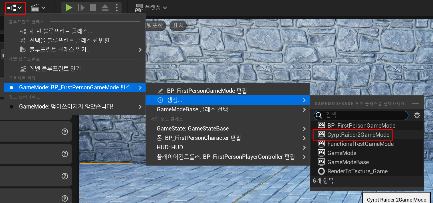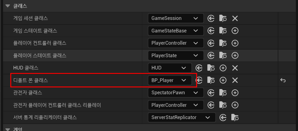 이제 해당 게임모드에 우리가 만들었던 캐릭터를 디폴트 폰 클래스로 지정해준다.