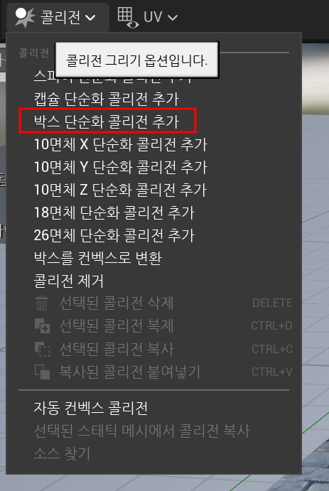 우선 해당 메시의 에디터로 들어가 박스 단순화 콜리전을 추가해준다.