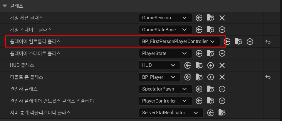 따라서 플레이어 컨트롤러 클래스를 1인칭 템플릿에 있는 BP_FirstPersonPlayerController 클래스로 설정해야한다.