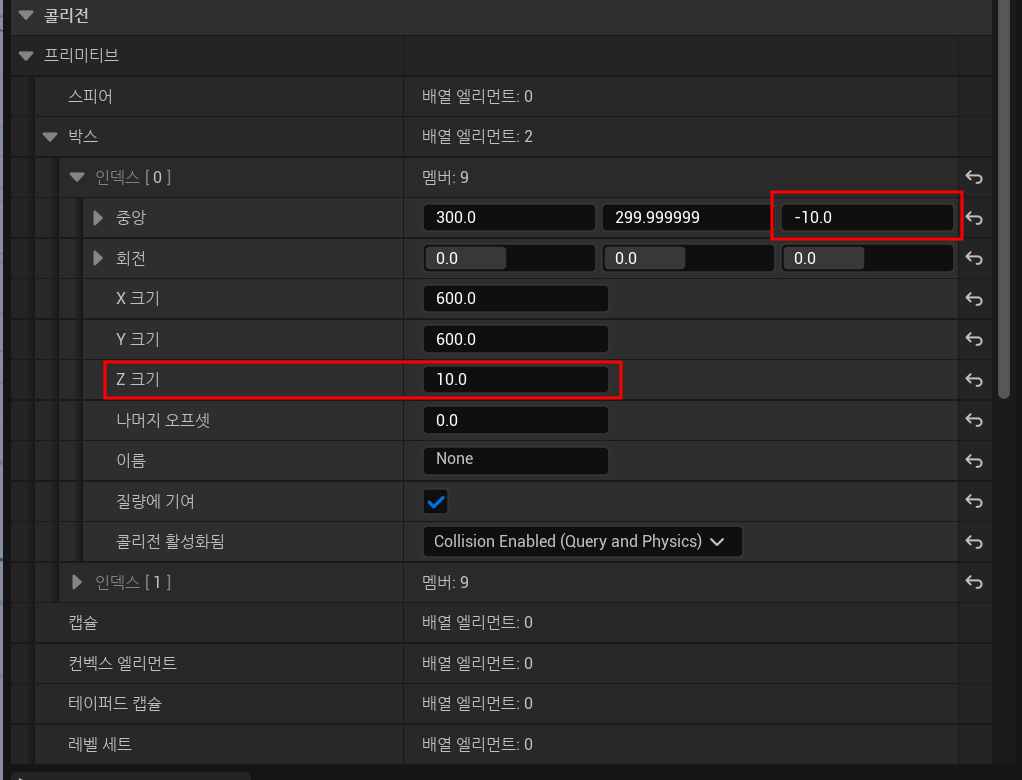 하지만 이 상태로는 콜리전이 위로 10 증가하여 캐릭터가 바닥 메시에서 떨어져 약간 공중을 걷는 느낌을 받을 수 있다.